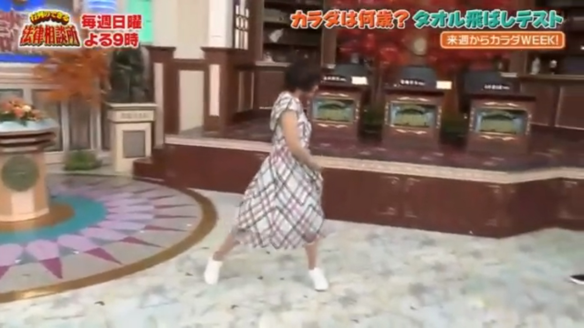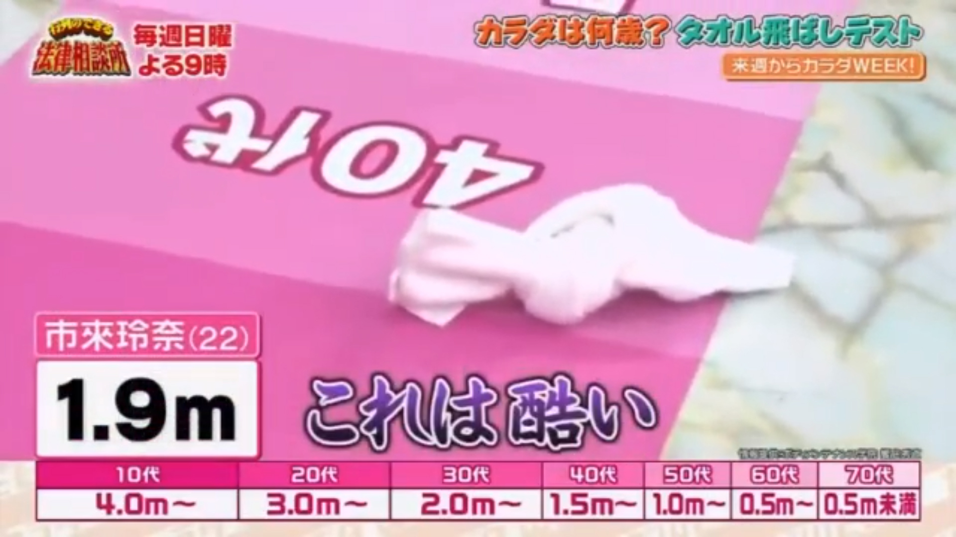 あなたのカラダは何歳?ということで、足先にタオルをはさみ、その場でジャンプしながらタオルを跳ばして、その跳んだ距離からカラダ年齢を測定。市來アナ(22歳)の結果は1.9mでカラダ年齢は40代。後藤さんからは「これは酷い。あんなに踊れるのに40代やで君!」と突っこまれた。ちなみに後藤さん(44歳)は1.7mで、50代という結果でした。