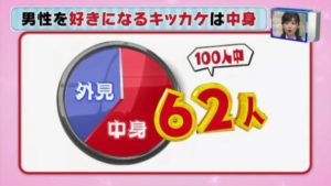 「男性を好きになるキッカケは中身?」というアンケートでMCの内村光良さんから問われて、市來アナは「外見を気にされている方のほうが、やはりいいのかなとは思いますね。美容意識だったりとか、何かそういうところは凄くいいのかなって。」と話した。