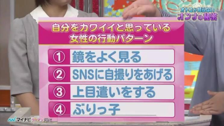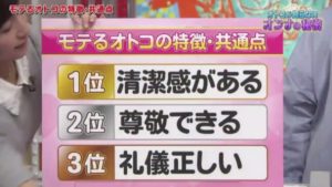 番組は、事前に20~50代女性100名に本音を探るネットアンケートを実施して、それらの回答や集計結果を見たり、ランキング(他社調べ)を紹介したりと1時間番組で10項目程度が放送された。