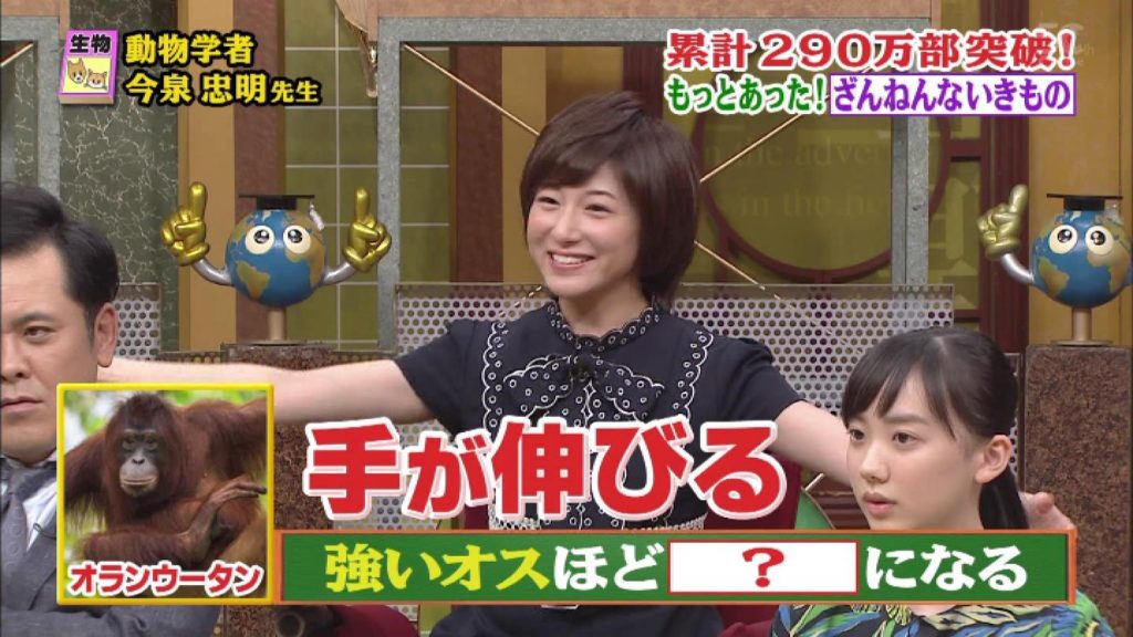 市來アナ「手が伸びる。だからいろんなメスのオランウータンををこうやって。(大きく手を広げてメスを抱え込むように)」