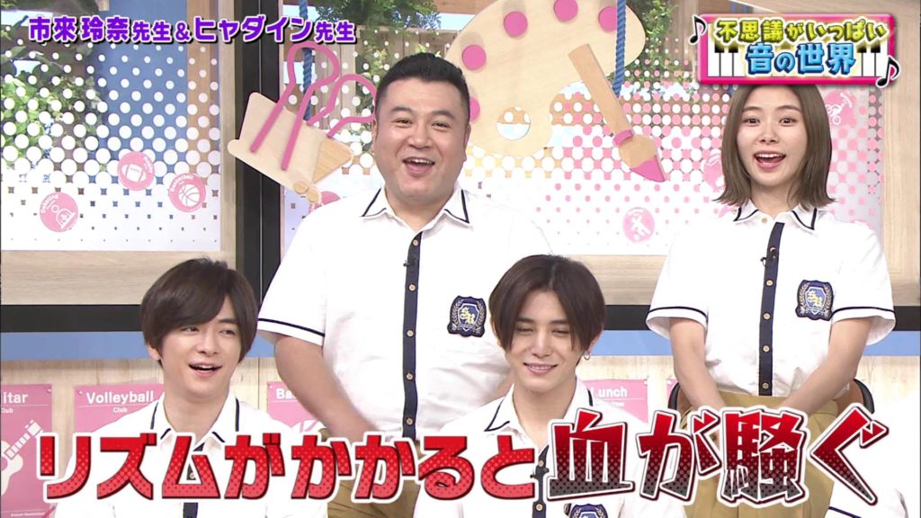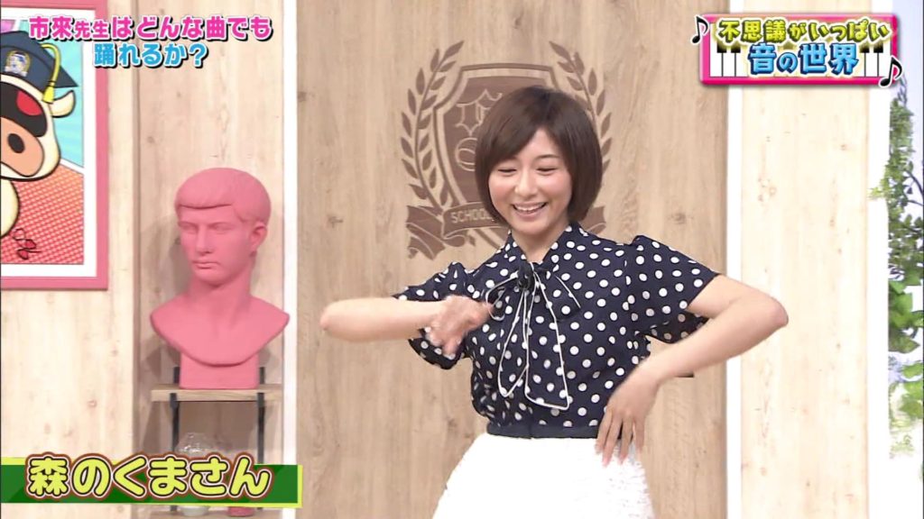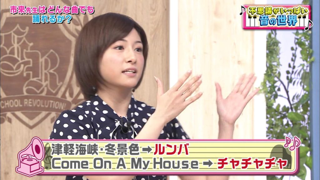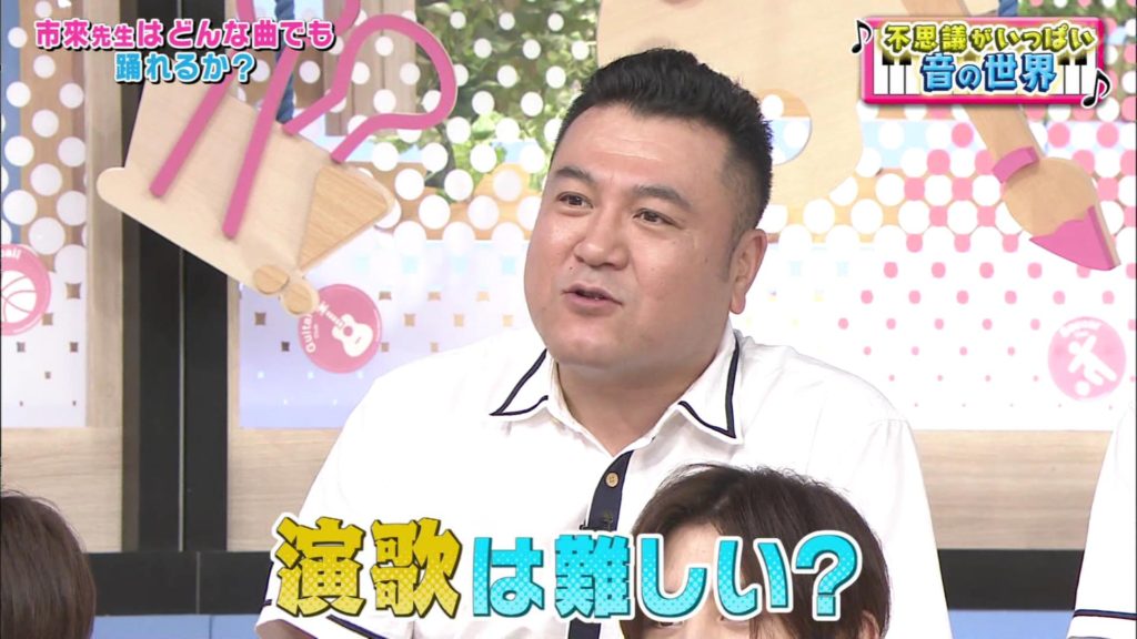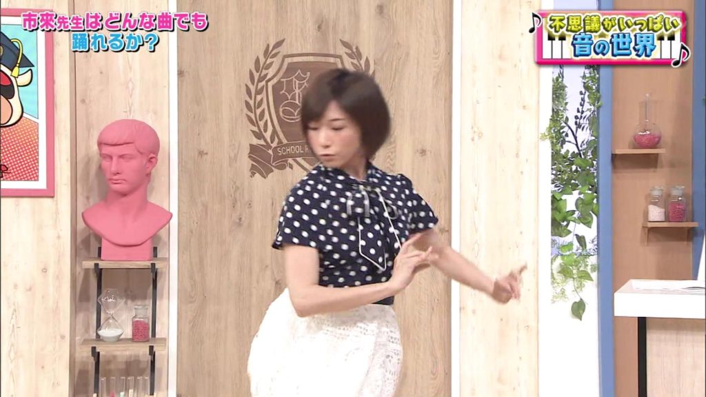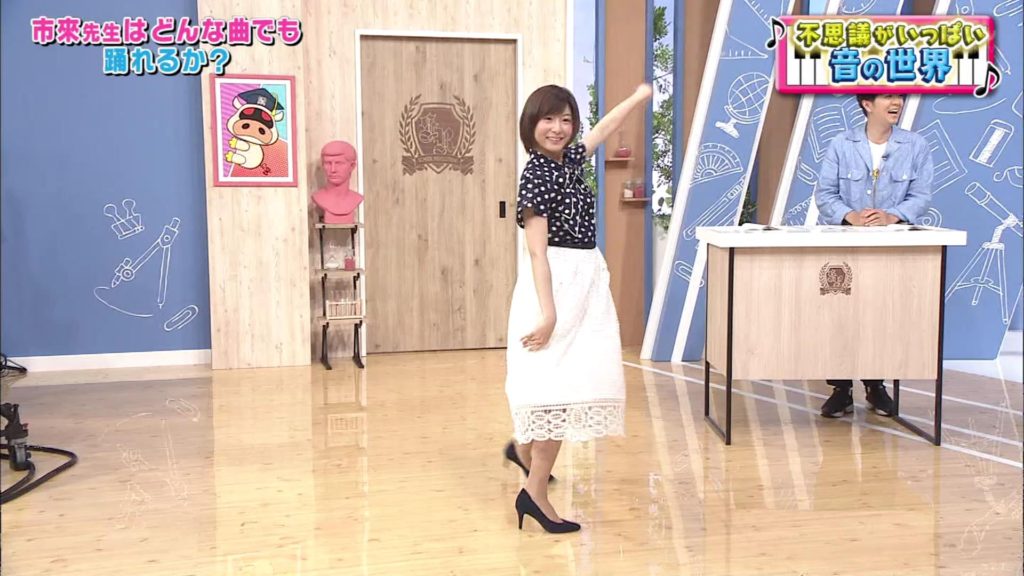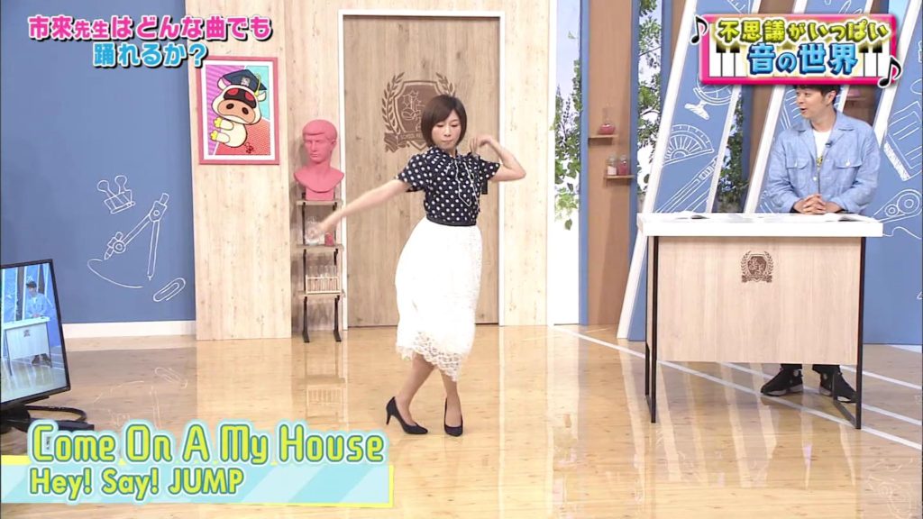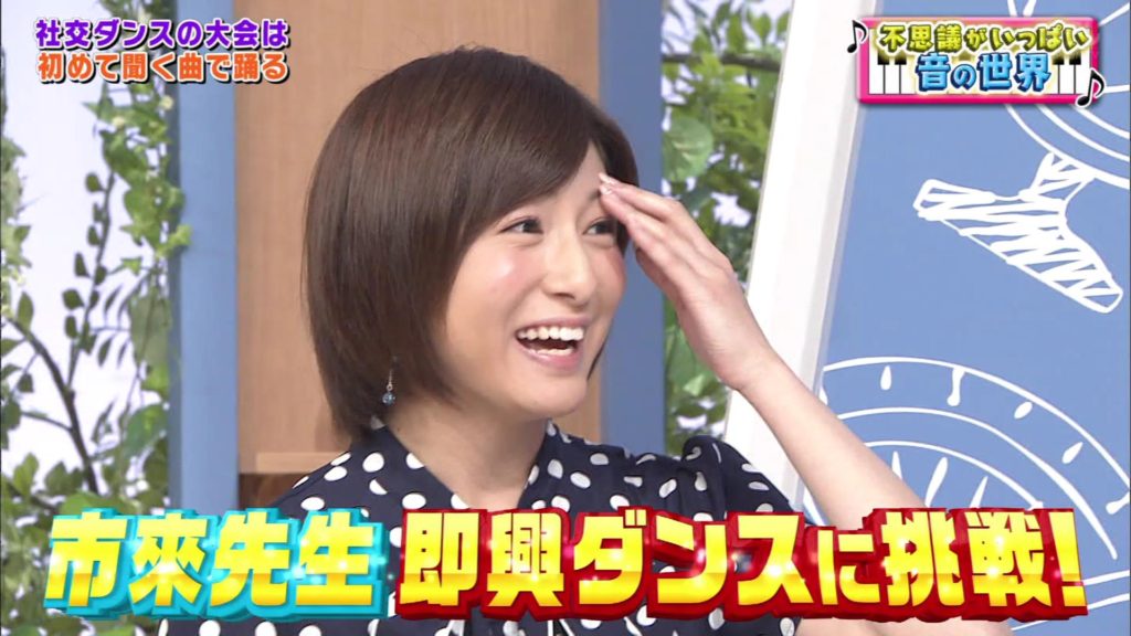 早速、番組MCの内村光良さんから「市來先生はねぇ、社交ダンス日本代表にも選ばれたことがあるという、じゃあ音楽には結構やっぱりねぇ!」と問われると市來先生は「そうですね。リズムがかかると、血が騒ぎますね!」と答え、普段の印象とのギャップからか「 ウォォォォ 」という声が、周りから一斉に上がった!笑
